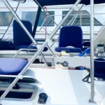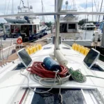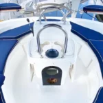 The stainless steel arch supports both the solar panels and wind turbine, and the package includes a 10ft rigid bottom Avon inflatable dinghy with a 9hp outboard engine. The boat is also fitted with 2-year-old AGM closed cell batteries, including a starting battery for reliable performance.