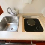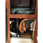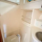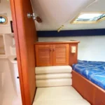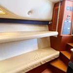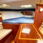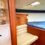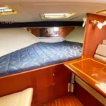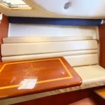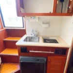 Below, you’ll find a well-designed cabin with beautiful teak interior featuring comfortable accommodations for four, a fully equipped bath with shower and electric head, a galley that includes an electric cooktop, dual-voltage refrigerator and microwave, all the essentials needed for extended trips. A custom built air-conditioning system that cools both the cabin and the enclosed cockpit — a rare and welcome upgrade for hot summer days.